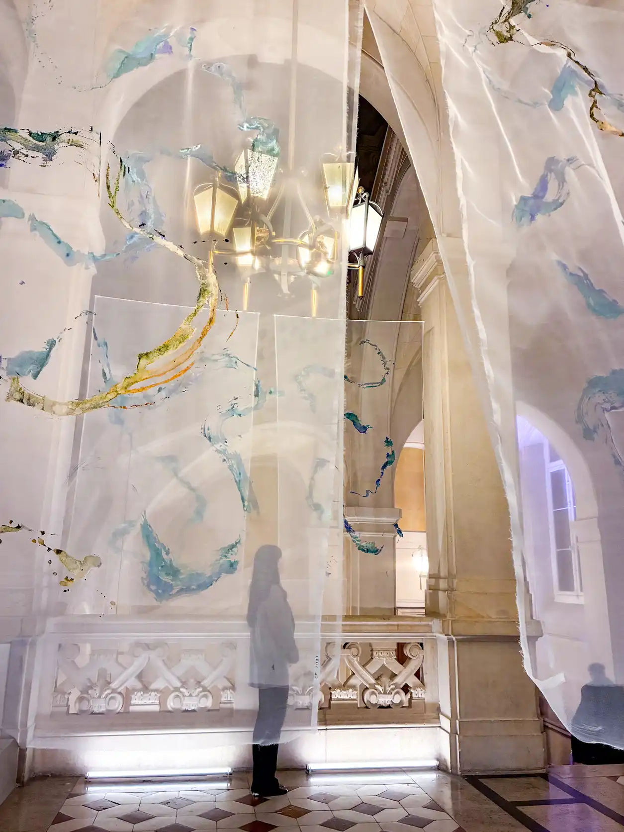 Floating in the palace, the installation confronts the solidity of stones with the impermanence of life