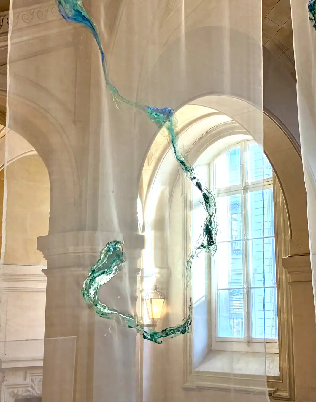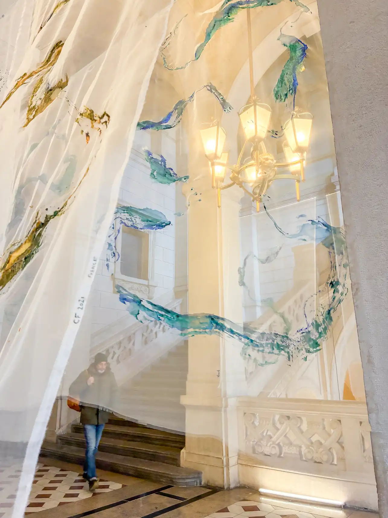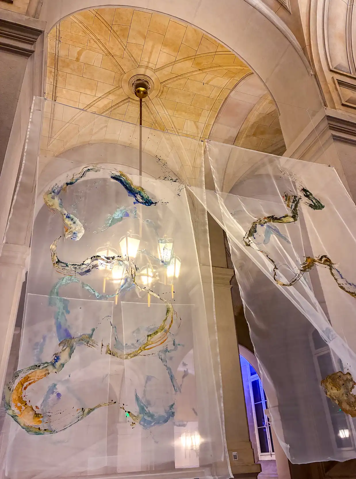 Floating in the palace, the installation confronts the solidity of stones with the impermanence of life