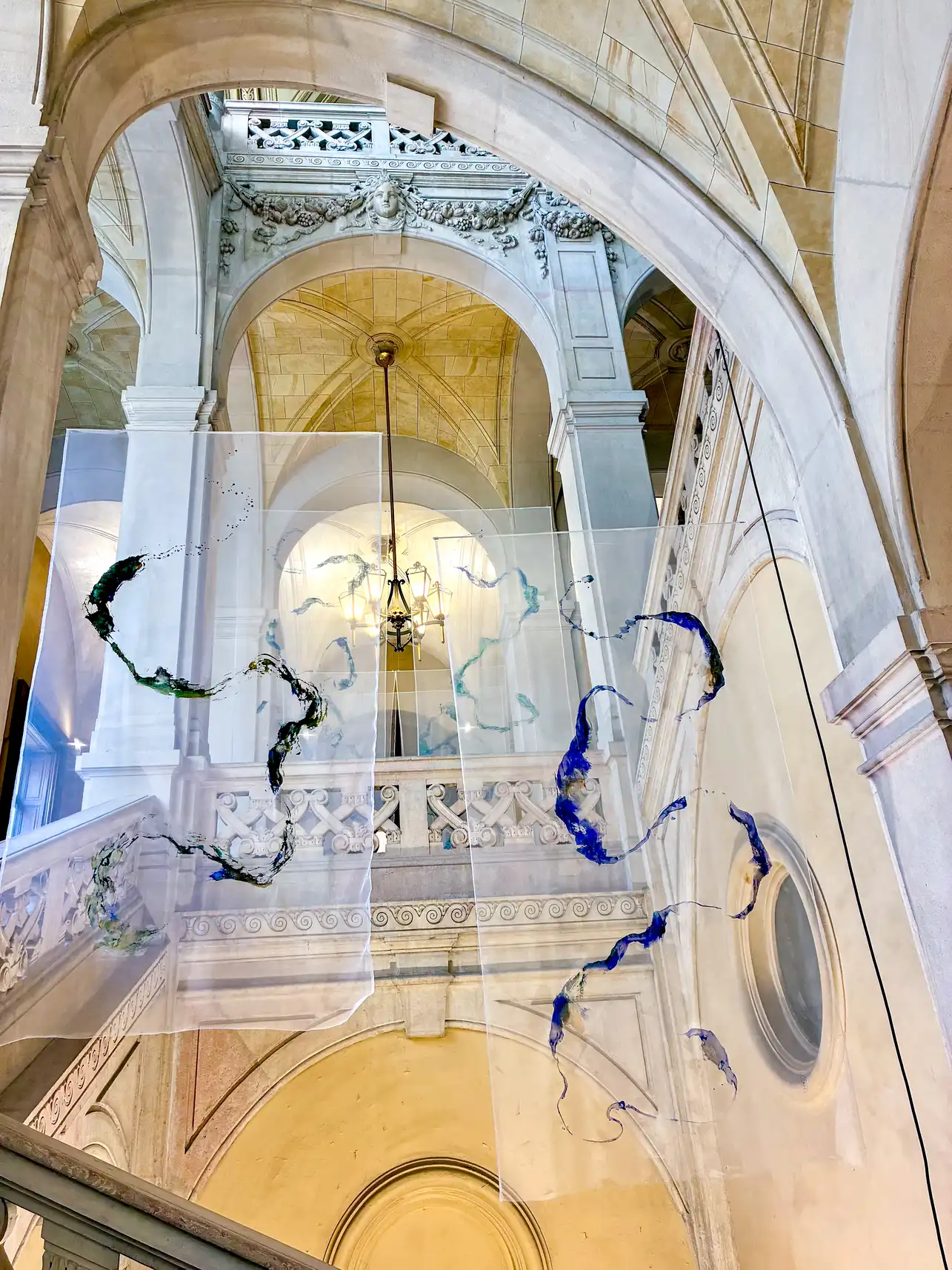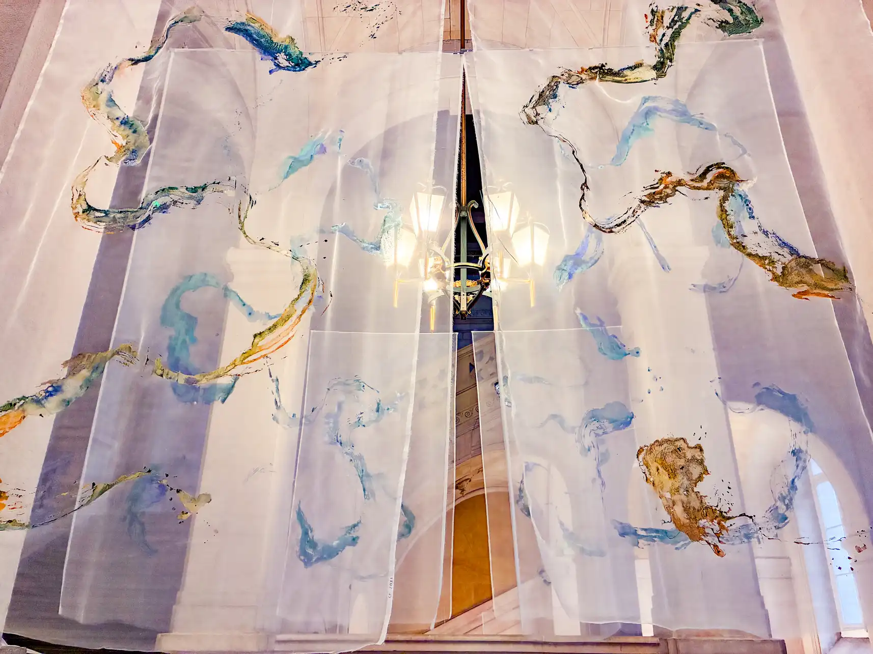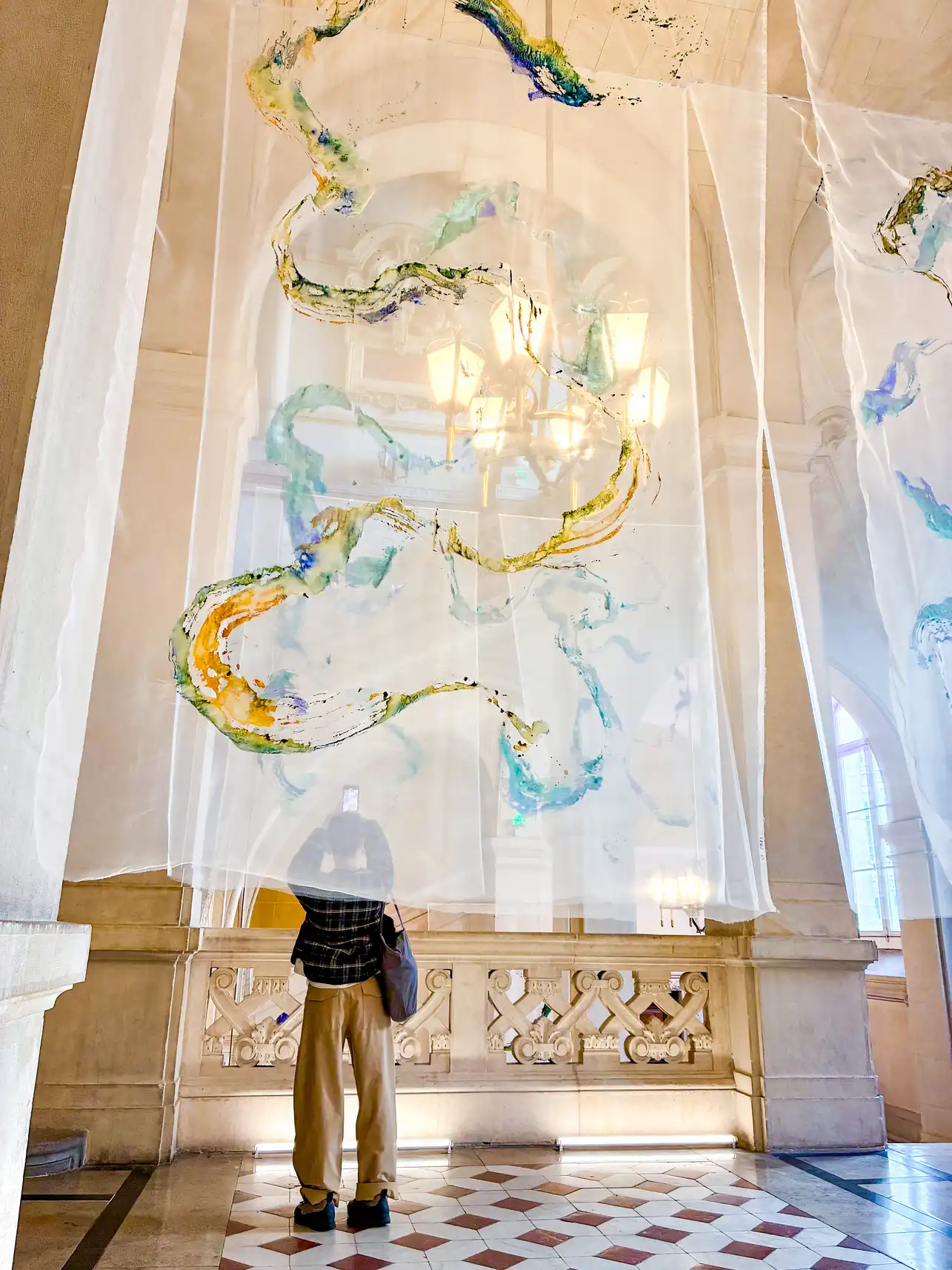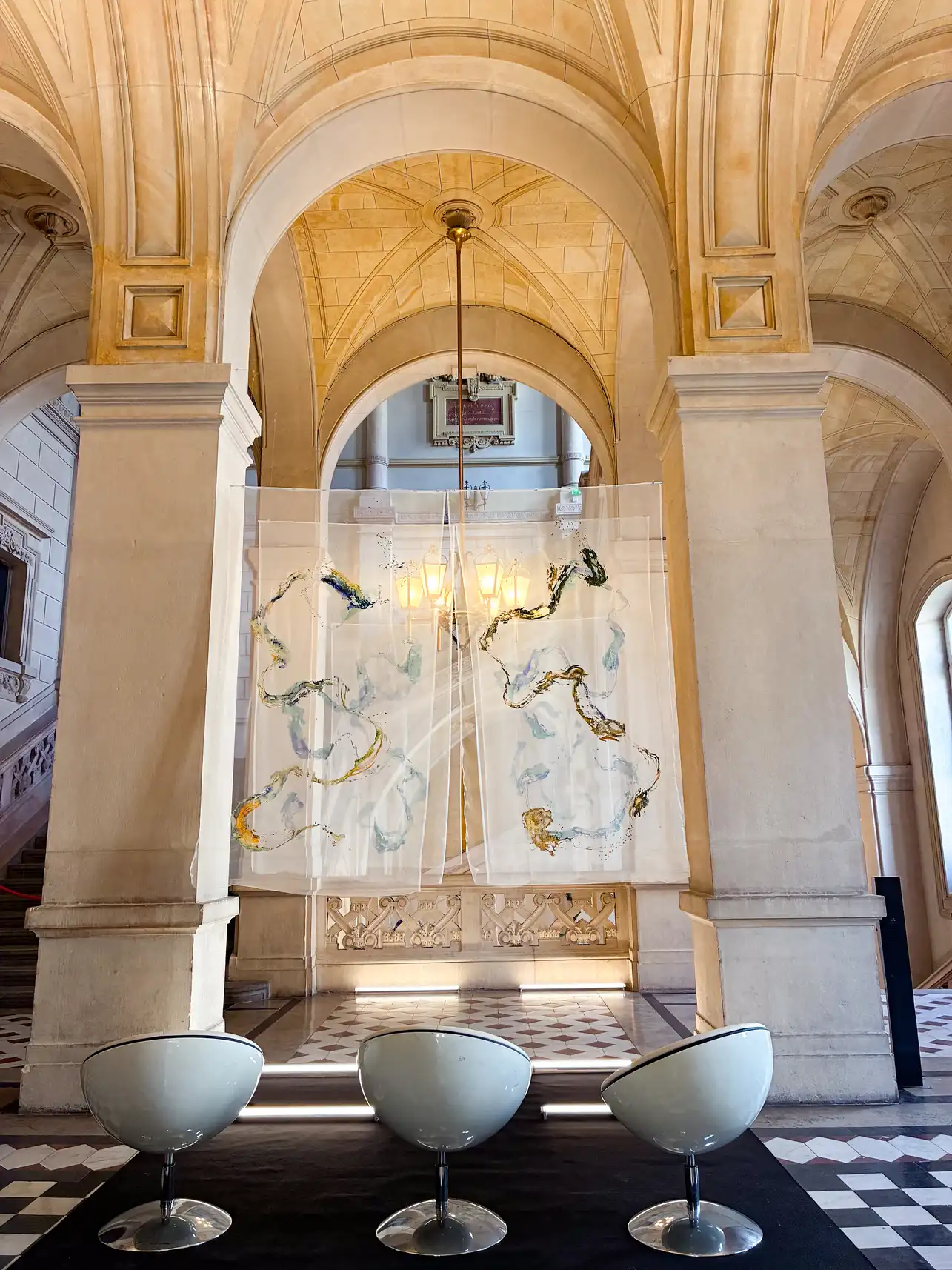 Floating in the palace, the installation confronts the solidity of stones with the impermanence of life
